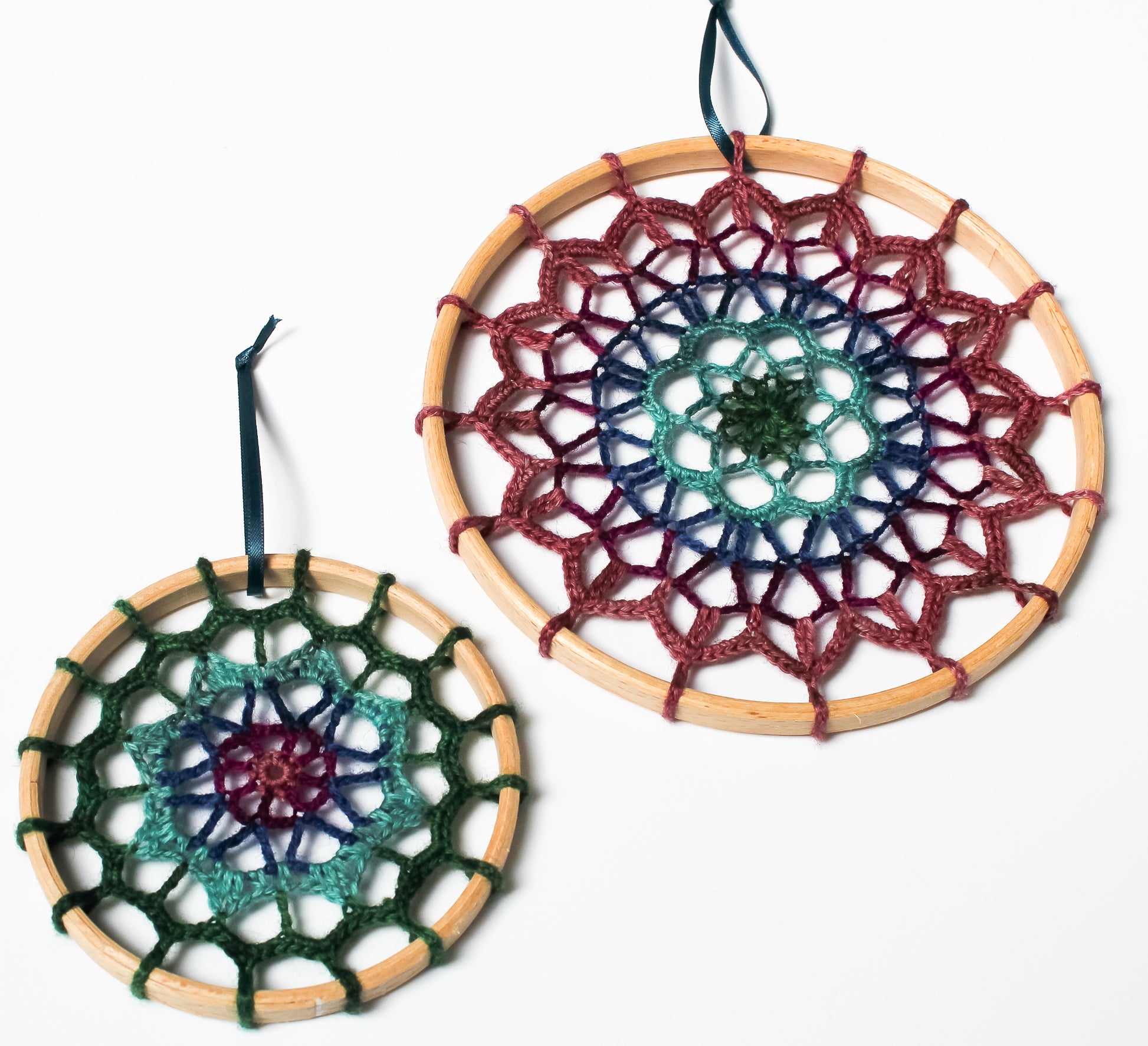 This listing is for the digitial download of these patterns, designed as a pair and use about 5x5g mini skeins of sockweight yarn and a 10cm and 15cm hoop. Great for stash busting, trying a new skill, or for making gifts!