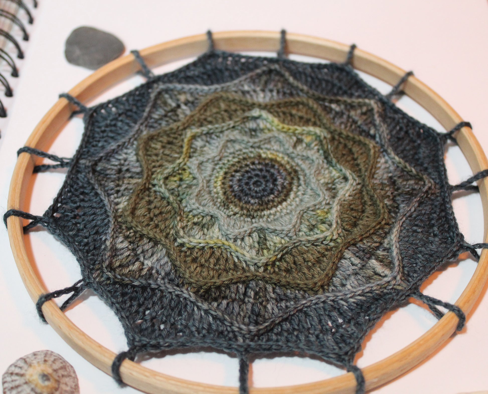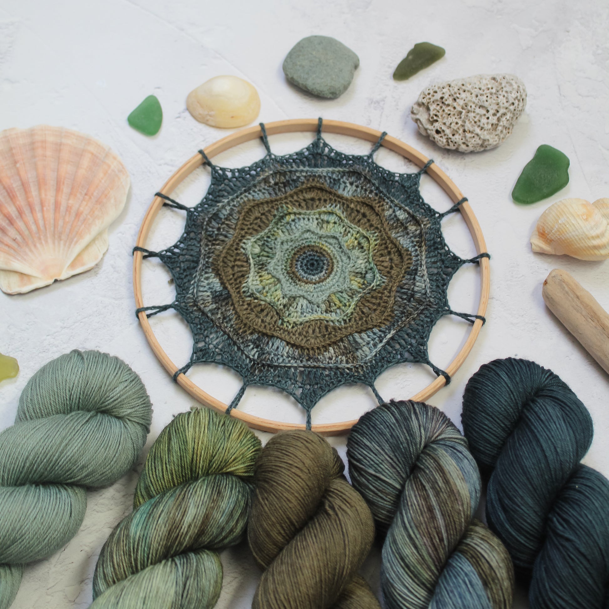 This kit contains the hoop, yarns, pattern, chart and ribbon for hanging to make this beautiful coastal inspired 17.5cm (7in) crochet mandala. Inspired by the beautiful southwest coastline and these gorgeous yarns from The Camel’s Yarn. A gradient of blues and greens create a wavy textured piece of wall art. This is an intermediate level pattern.